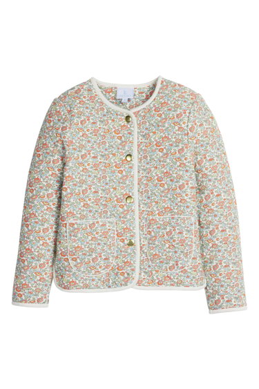 Meet James, a bright, happy floral in shades of blue, orange, and yellow! Our Sophie Jacket is a favorite of the season with its on-trend quilting, two front pockets, and gold snap buttons down the front. This beautiful James Floral piece is the perfect match to our Sophie Skirt and can be layered over our Solid Ribbed Turtleneck - Ivory for an elevated look.