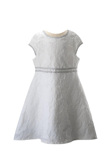 Let your little girl shine like a diamond in our Sparkle Trim Damask Dress. This timeless A-line dress is the perfect mix of girly and sophisticated, with a beautiful white damask and delicate floral design. The silver sparkle braiding trim adds a touch of glamour to the neck line, cup sleeves, and waist. With zip closure at the back for a flawless fit. Perfect dress for flower girls!