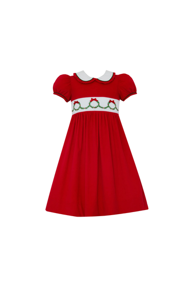 Red corduroy short sleeve dress with peter pan collar and smocked wreath design