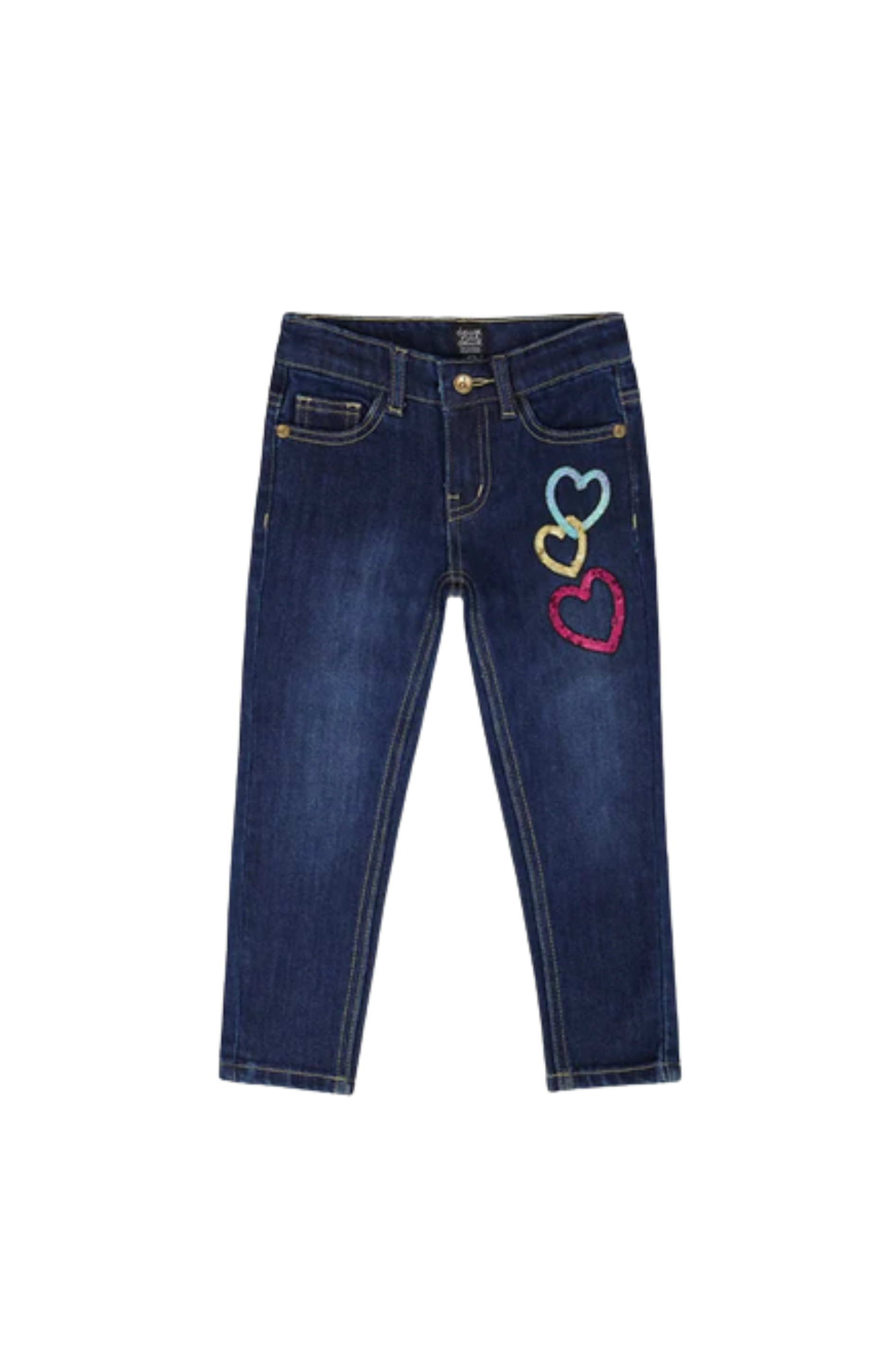 Our Stretch Jeans Blue Denim With Glittery Hearts are a sweet and stylish twist on a timeless staple. These slim-fit jeans feature colorful glittery heart appliques on one leg, a classic five-pocket cut, and contrast topstitching throughout. Made from a stretch cotton blend, they offer comfort and flexibility for every dance, dash, and twirl. Pair them with any top from our “Let's Dance!” collection for an effortlessly playful look.