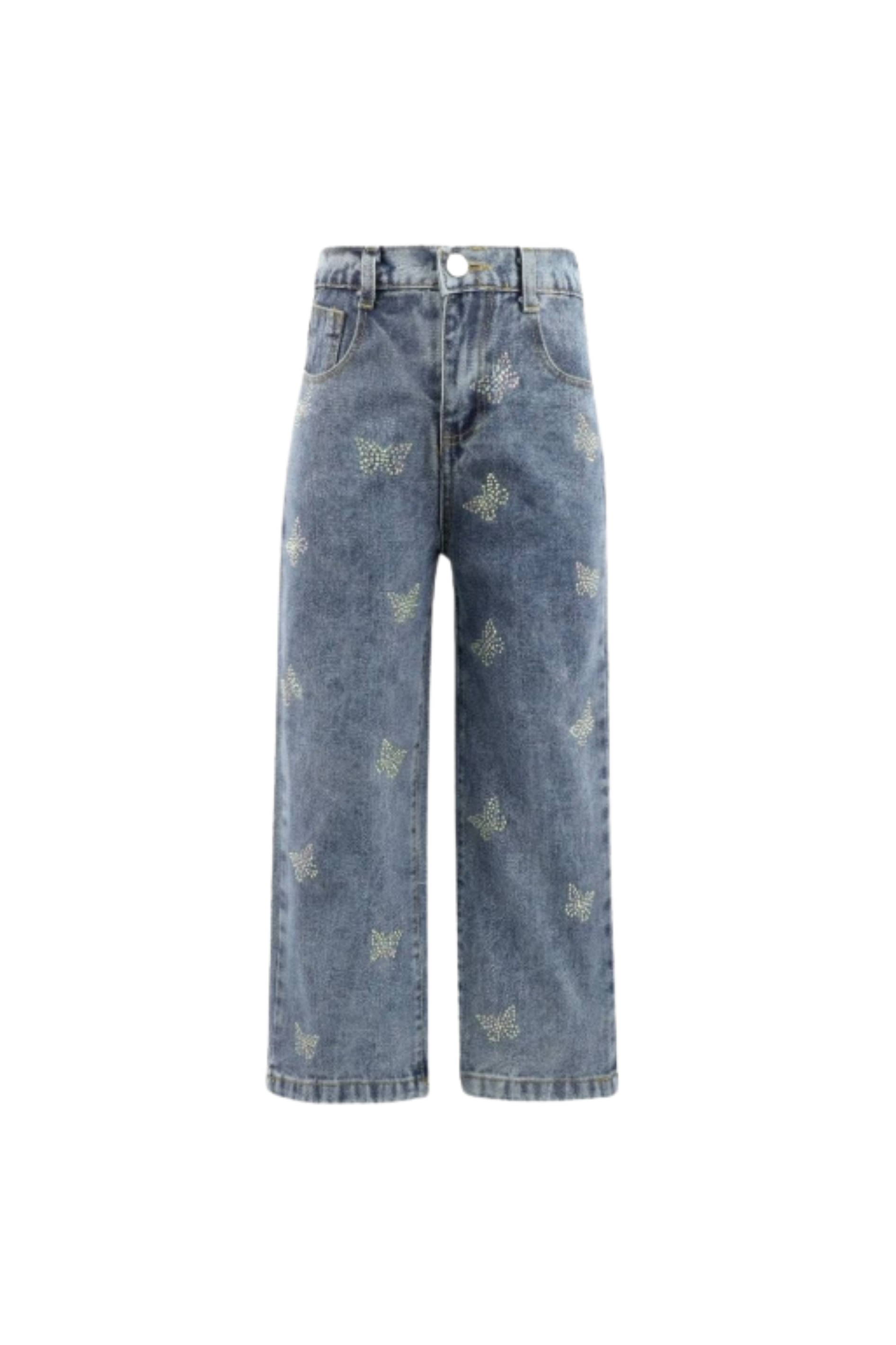 - Stylish denim jeans adorned with sparkling crystal butterfly embellishments for a whimsical and eye-catching look.