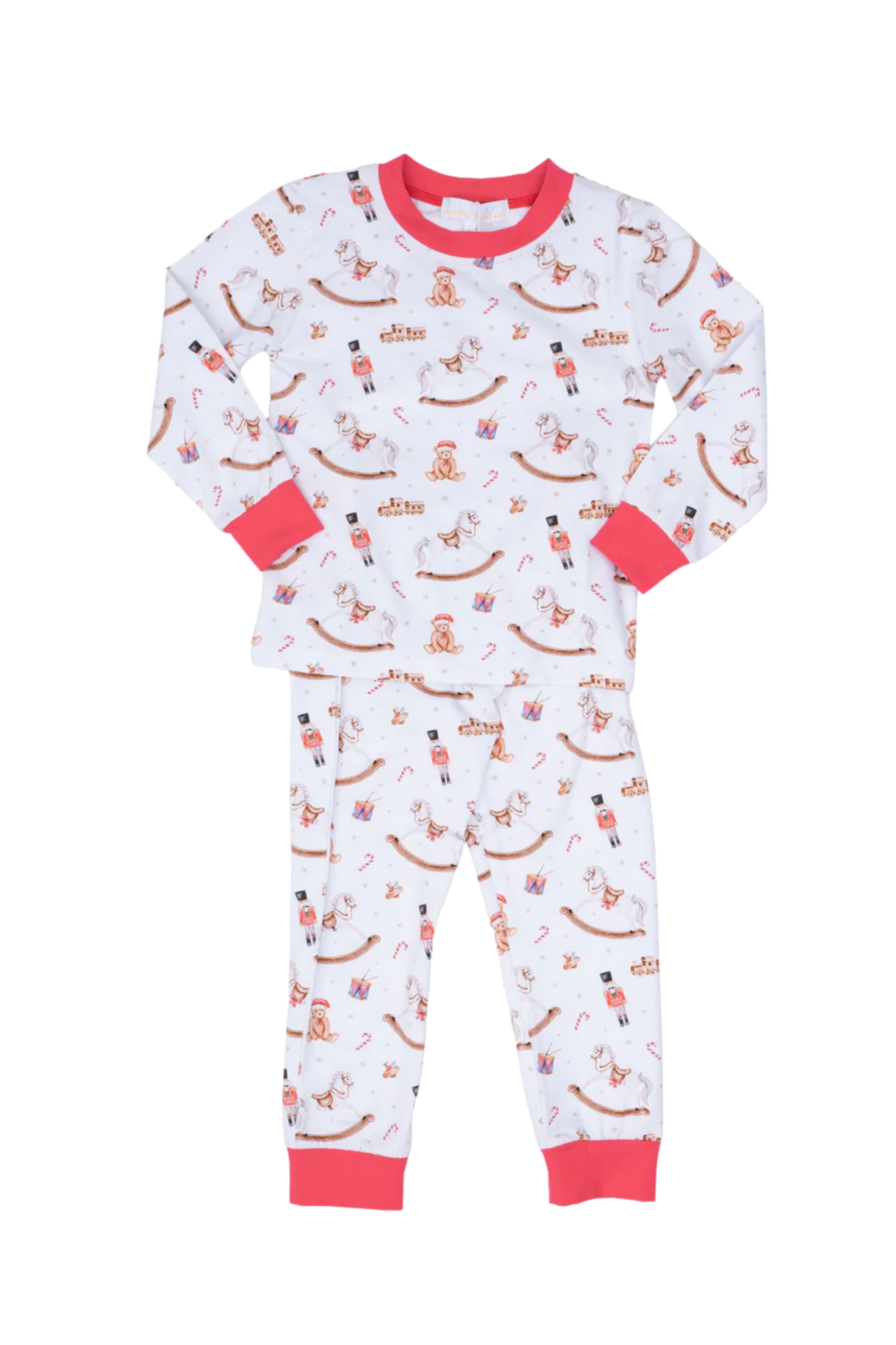 Crafted from soft, pima cotton, the Beary Christmas Loungewear Set showcases an elegant holiday print featuring rocking horses, teddy bears, and nutcrackers. Perfectly festive and comfortable, this romper is designed to keep little ones cozy and ready for Santa's arrival.