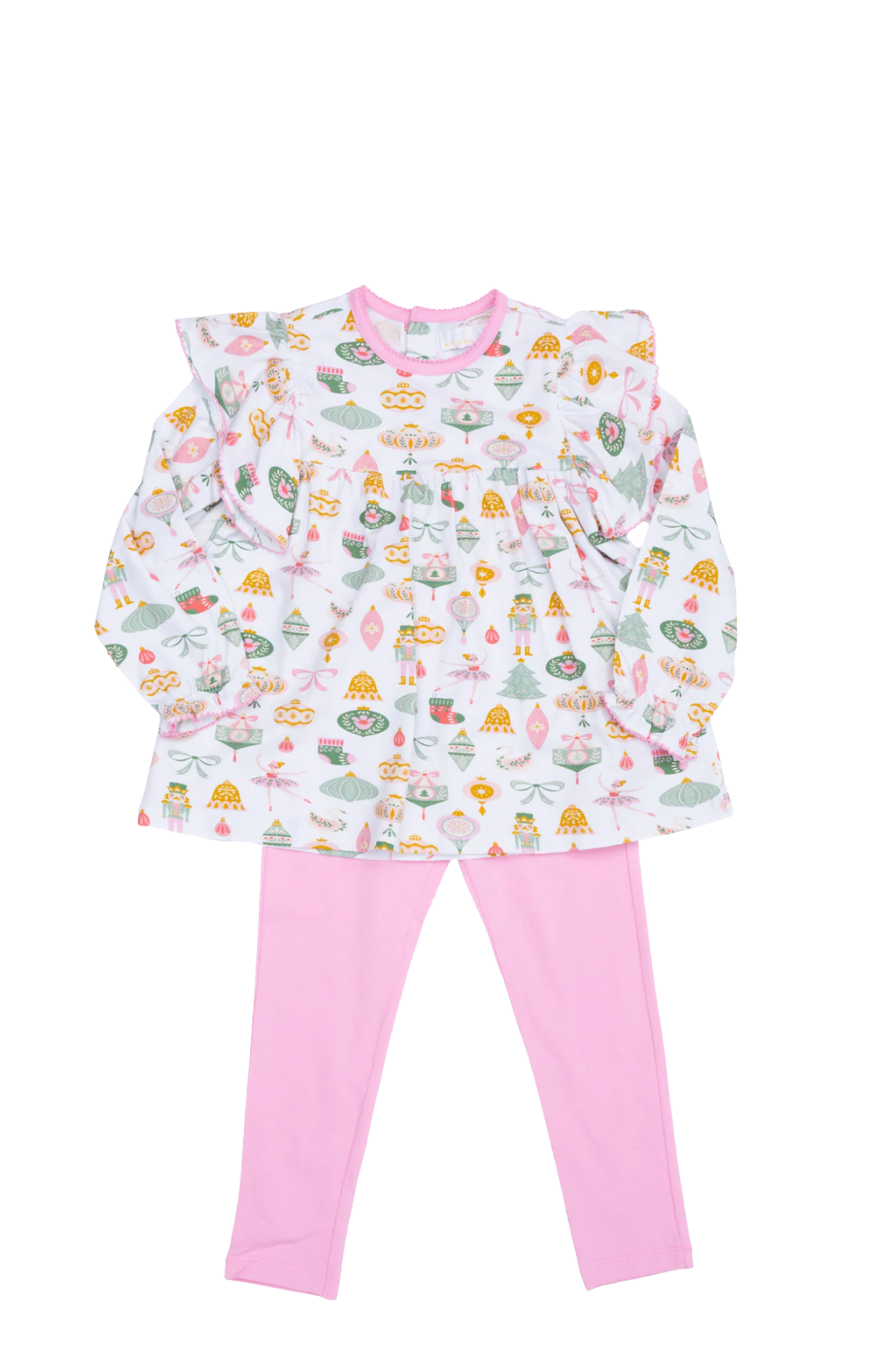 Celebrate the season in style with the Abree Sugar Plum Fairy Legging Set, crafted from the softest pima cotton for unmatched softness and comfort. Its whimsical Christmas print bursts with festive pinks, greens, and golds, perfectly capturing holiday cheer. Ideal for Christmas parties, this unique piece adds a playful yet elegant touch to your festive wardrobe.