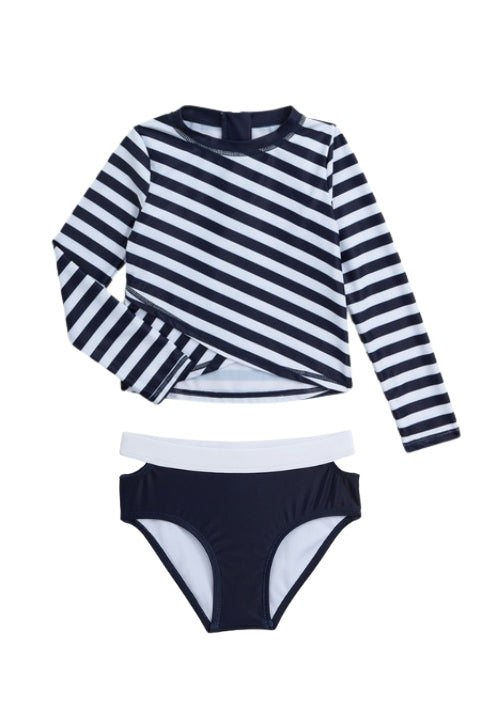 The Navy Stripe Oceana Rash Guard Set is made for sunny days and nonstop swimming. Designed with UPF 50+ sun protection, this long-sleeve rash guard features a covered neckline and wrists for extra coverage. Stretchy, quick-dry swim fabric and a contrast waistband keep her comfortable, secure, and ready for every splash.
