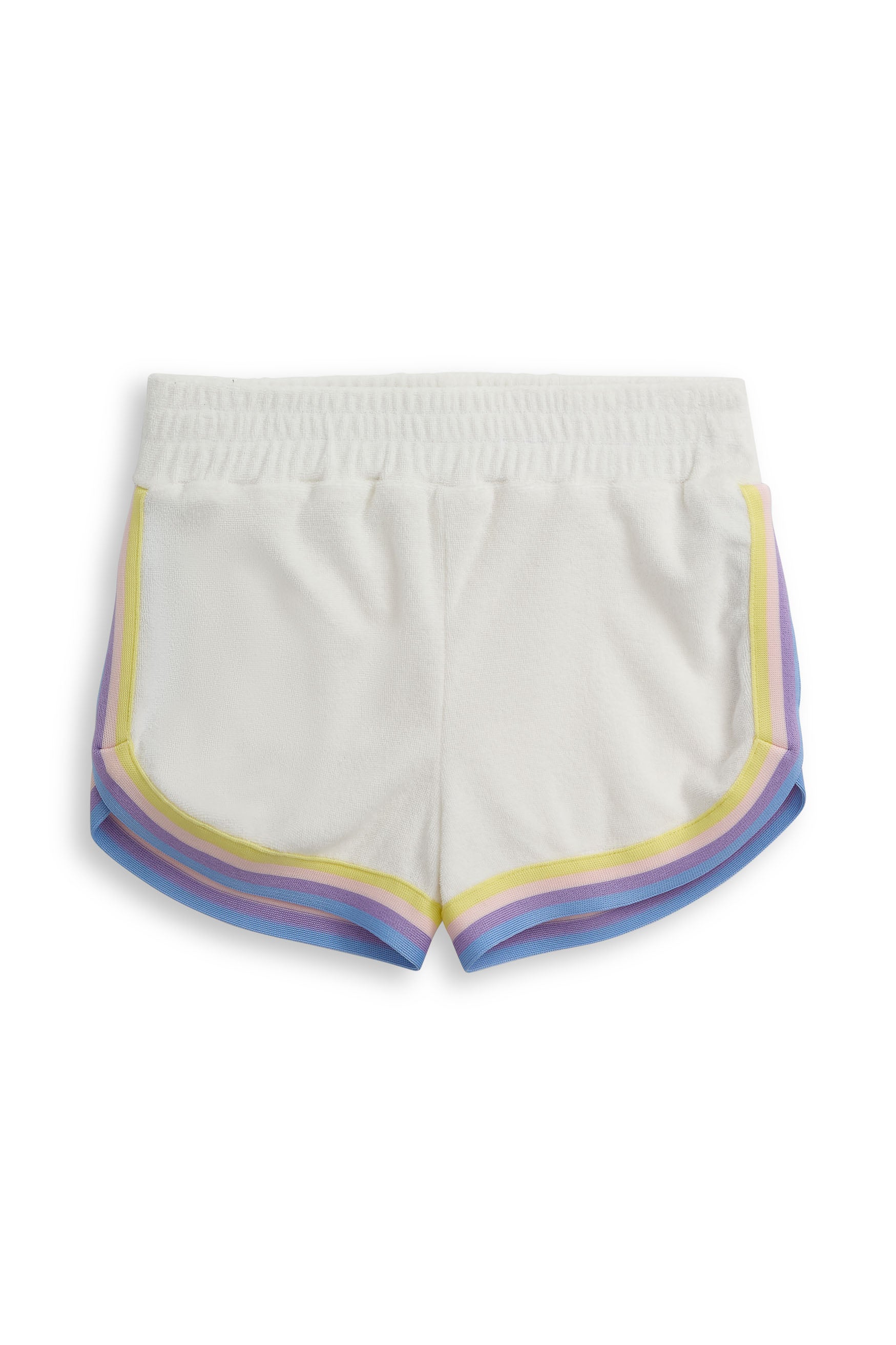 The White Lori Short is made for sunny days and nonstop play. Crafted from a soft, comfortable fabric with an easy elastic waistband, this relaxed fit short keeps kids moving freely. Multicolor striped trim along the sides and hem adds a fun pop, making it a warm weather favorite parents love. Pair with the Floral Heart Cara Sweatshirt to complete the matching set!