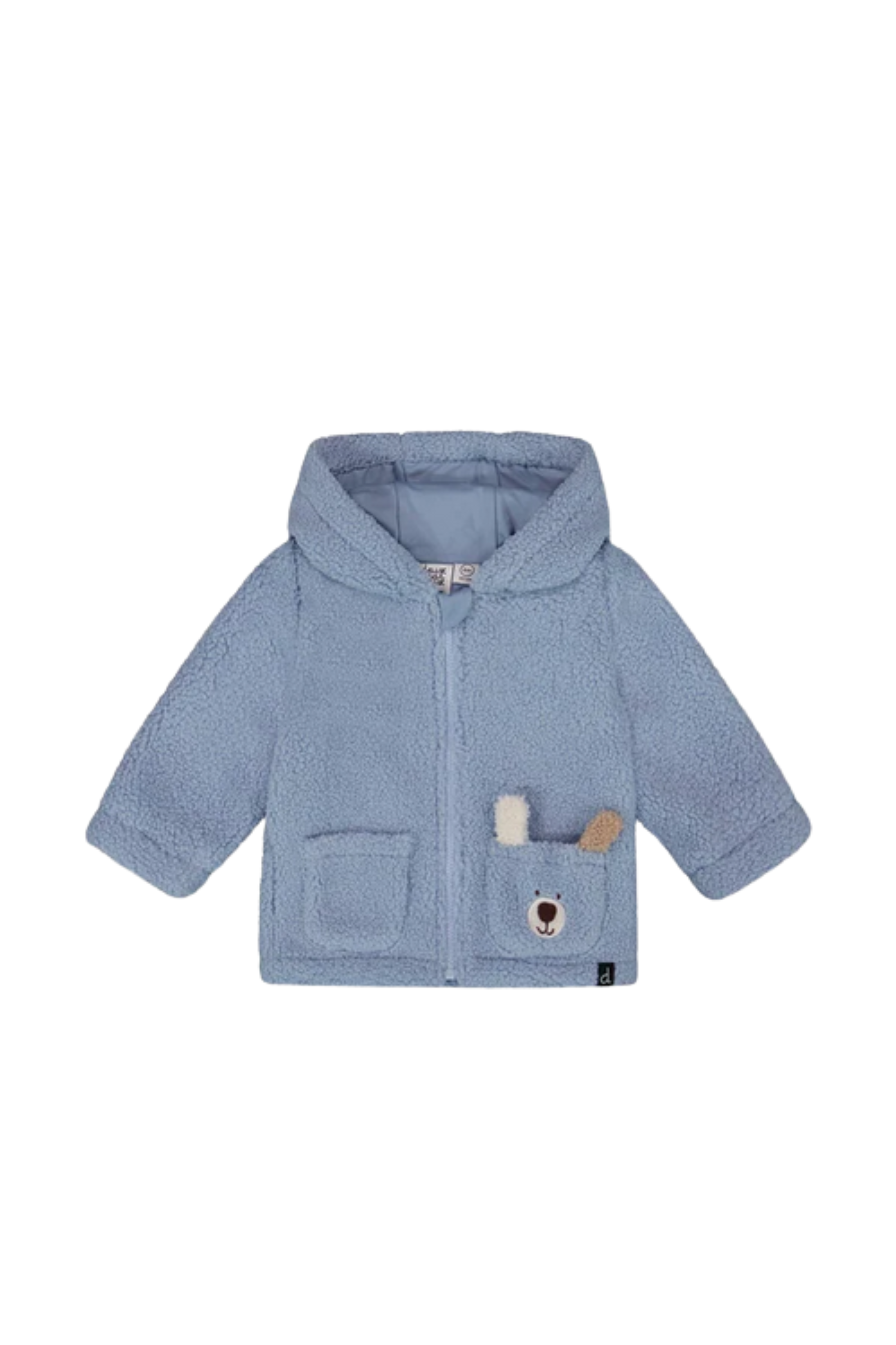 Wrap your little one in warmth and whimsy with our Plush Hooded Jacket in Light Blue! Made from soft and cuddly sherpa fabric, this coat features two front pockets—one with an adorable dog face and fabric ears, and the other for keeping small treasures safe. The full-length zipper makes dressing a breeze, while the cozy hood will keep your baby’s head warm and snuggly, perfect for chilly Fall-Winter days.