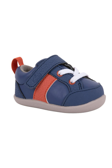 Retro inspired yet right on trend, our Connor court-inspired First Walker is ready for fun. Feet stay fresh on the inside thanks to recycled mesh lining, while the flexible navy leather upper ensures comfort during all of their early adventures.