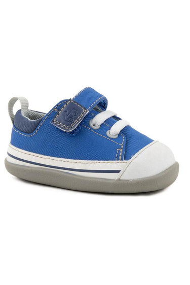 - Blue recycled polyester upper with faux-leather detail and rubberized toe cap to protect little toes.