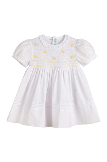 Meet the sweetest little dress for your sweet little girl! This vintage-inspired dress features hand-made smocking and daisy embroidery, and lovely ruffle trim around the edges.
