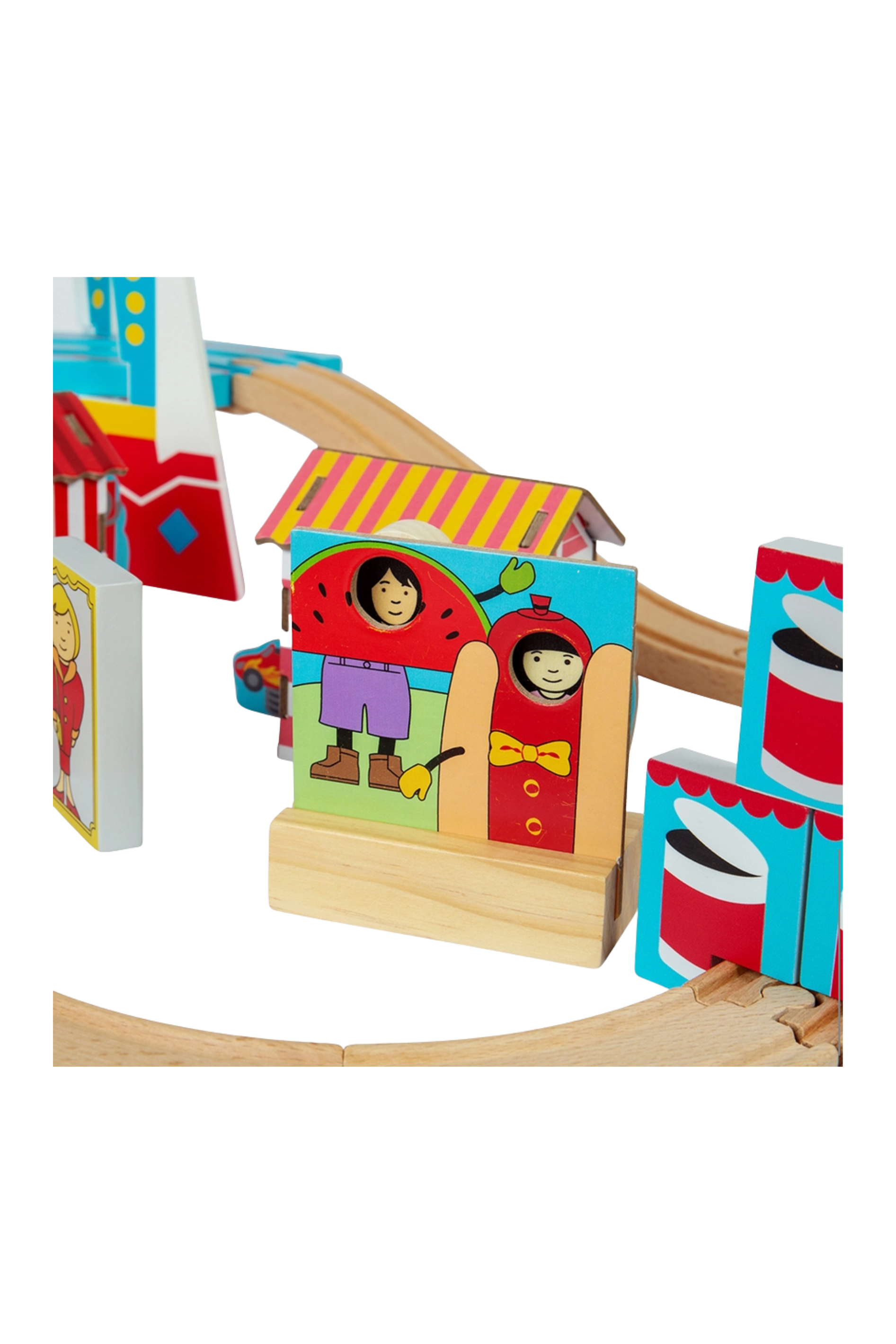 All the fun of the fair! Our 54pc wooden train set is full of accessories, including a circus tent, helter skelter, carnival goers, food trucks & much more.