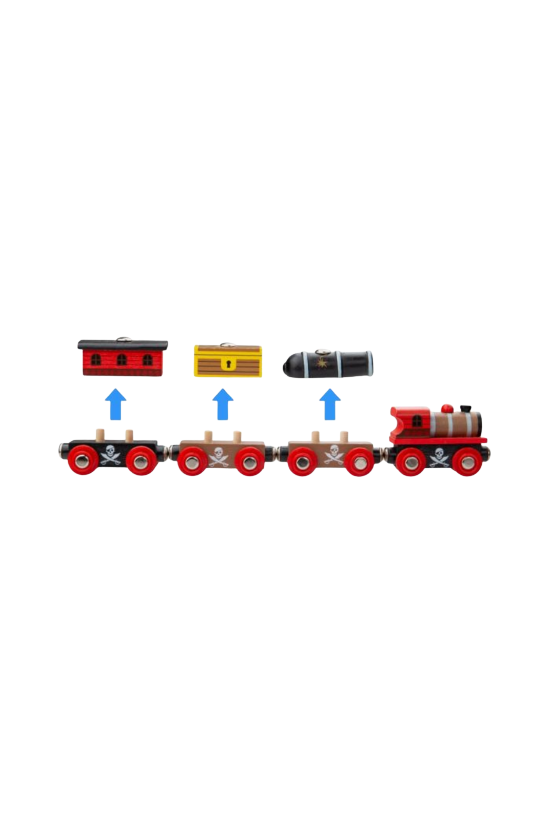 Ahoy, me hearties! This wooden Pirate Train is ready for your little one's swashbuckling adventure on the high seas! The pirate engine pulls three carriages carrying removable loads including a cannon and a treasure chest! Supplied complete with two pieces of wooden Bigjigs Rail track and a buffer. Magnetic couplings ensure compatibility with all other engines and carriages in the Bigjigs Rail range. Most other major wooden railway brands are compatible with Bigjigs Rail. Made from high quality, responsibly sourced materials. Conforms to current European safety standards.