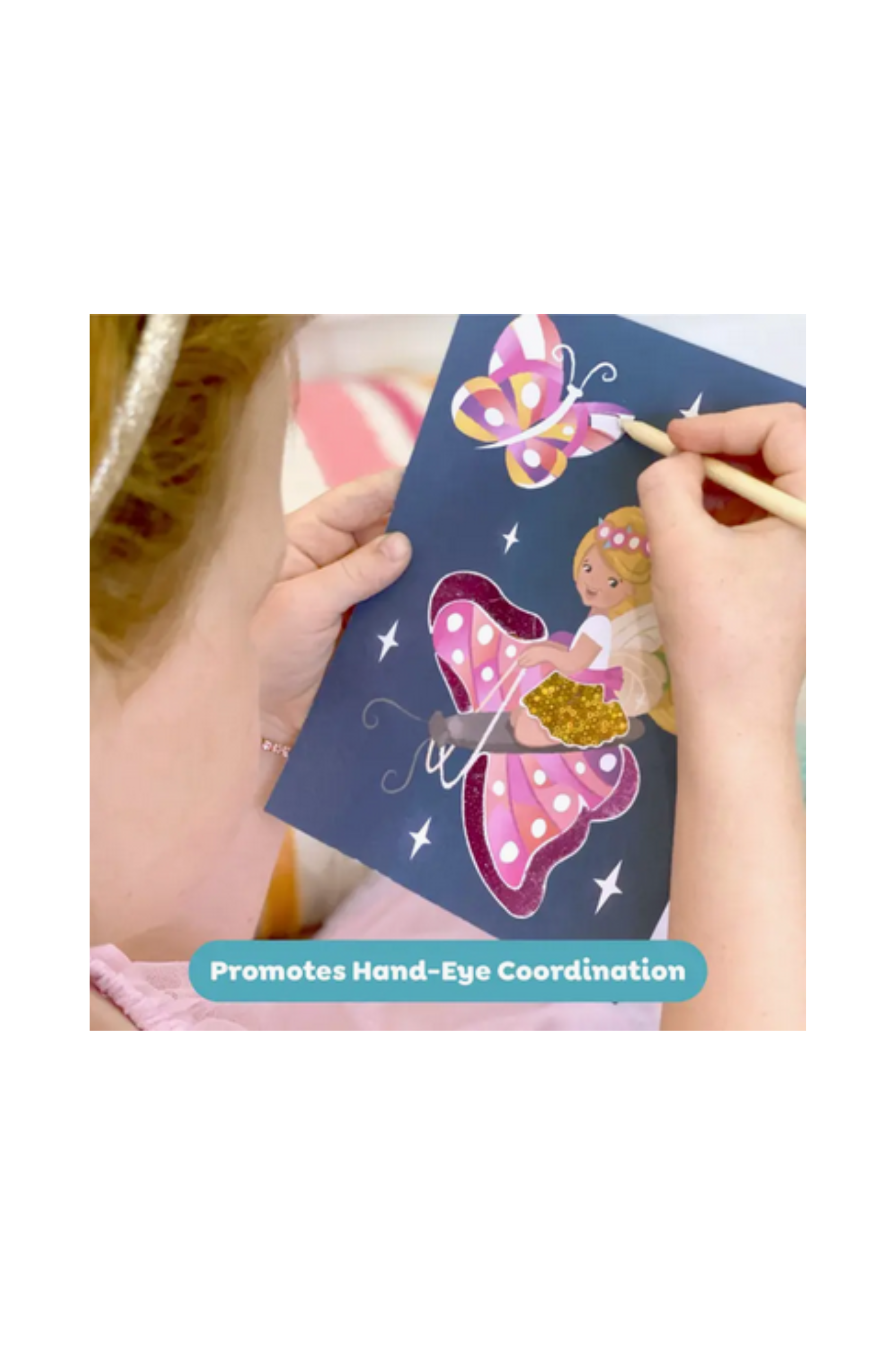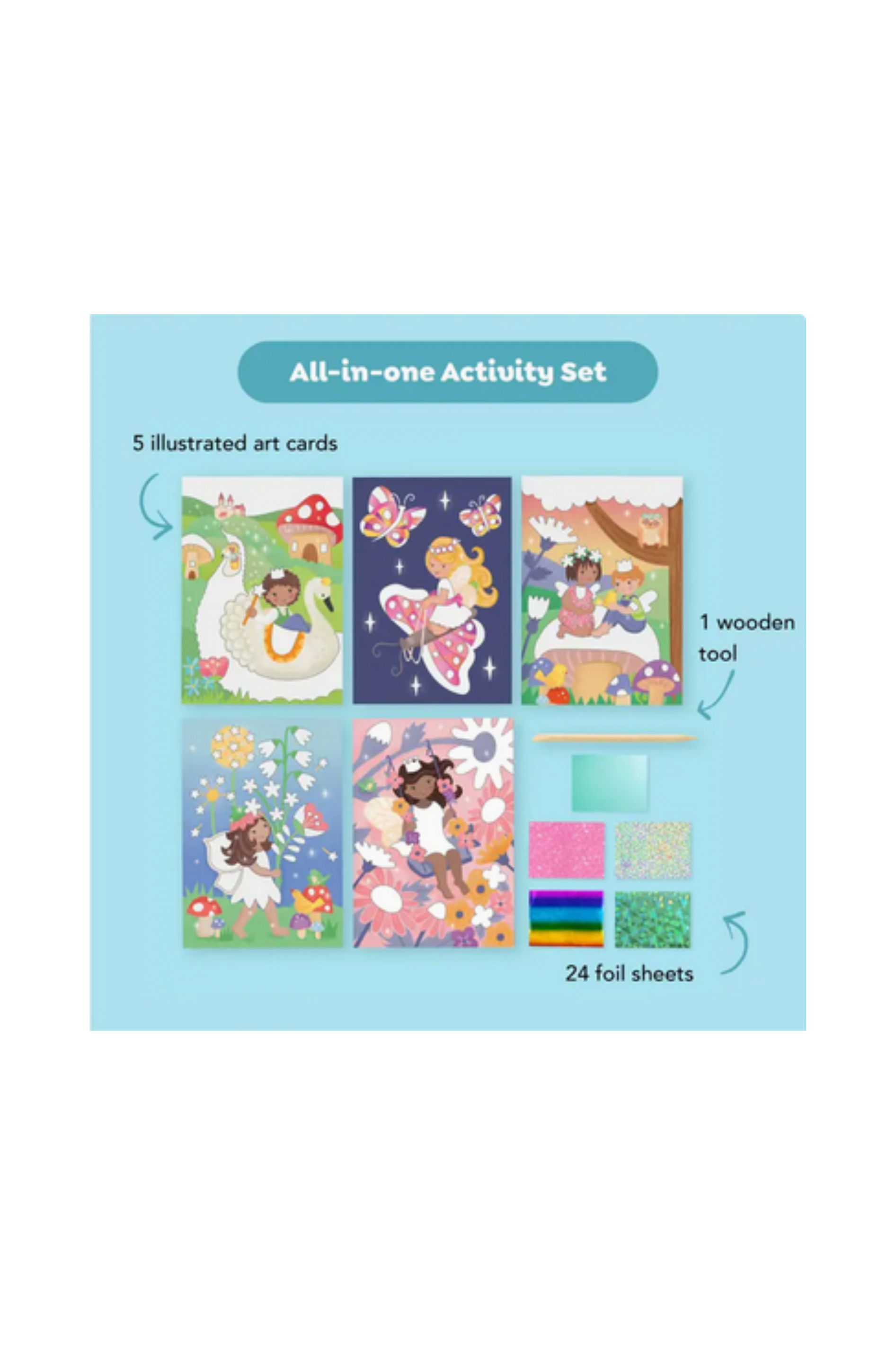 Butterfly wings, flower petals and fairy crowns are all waiting to be brought alive with a sparkling rub of holographic foil! Simply select an illustrated fairy Art card and use the enclosed lifter to peel sections off the picture, revealing adhesive sections. Grab a foil sheet, rub the foil onto the sticky area and voila! A beautiful shiny artwork.