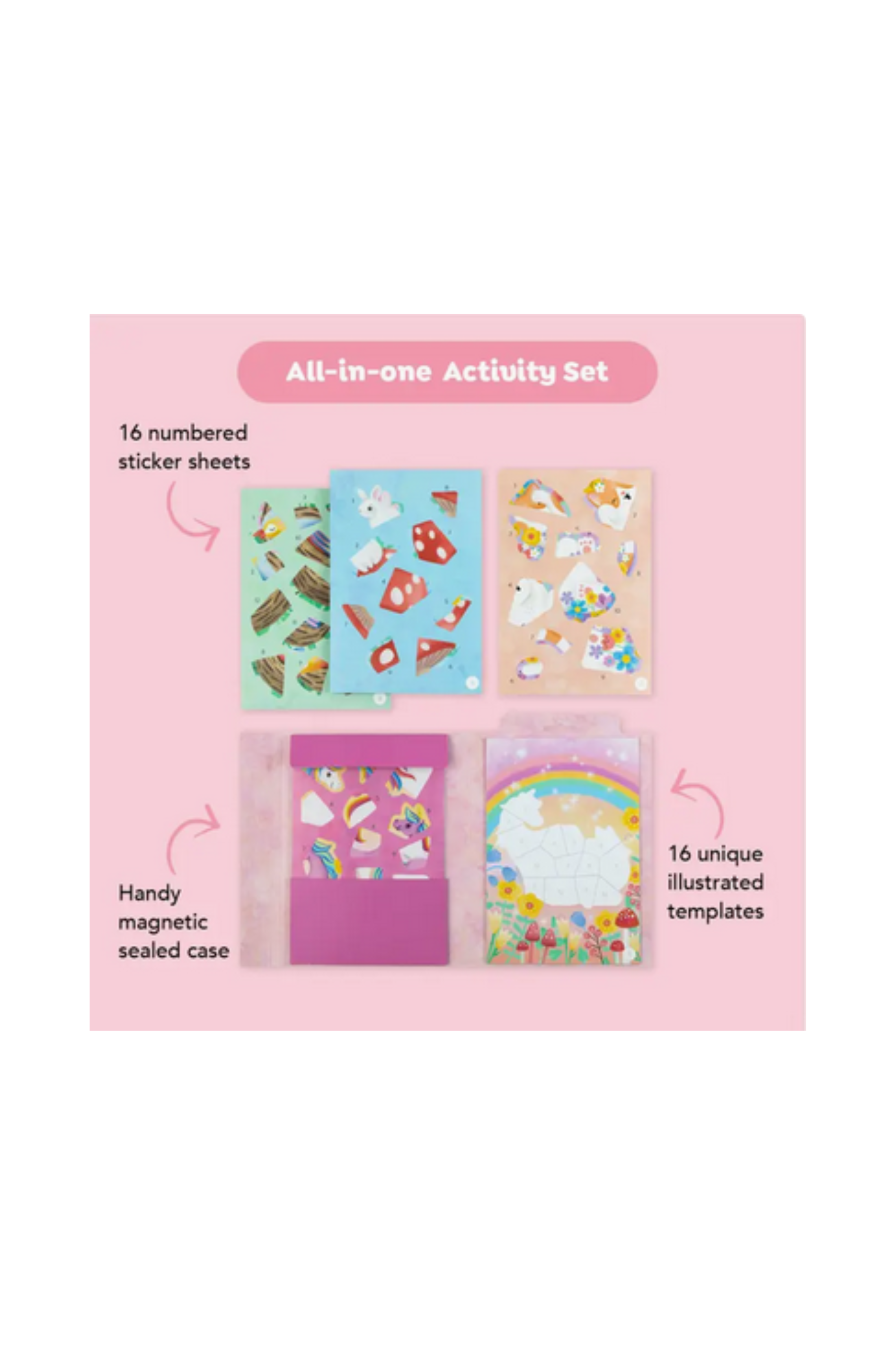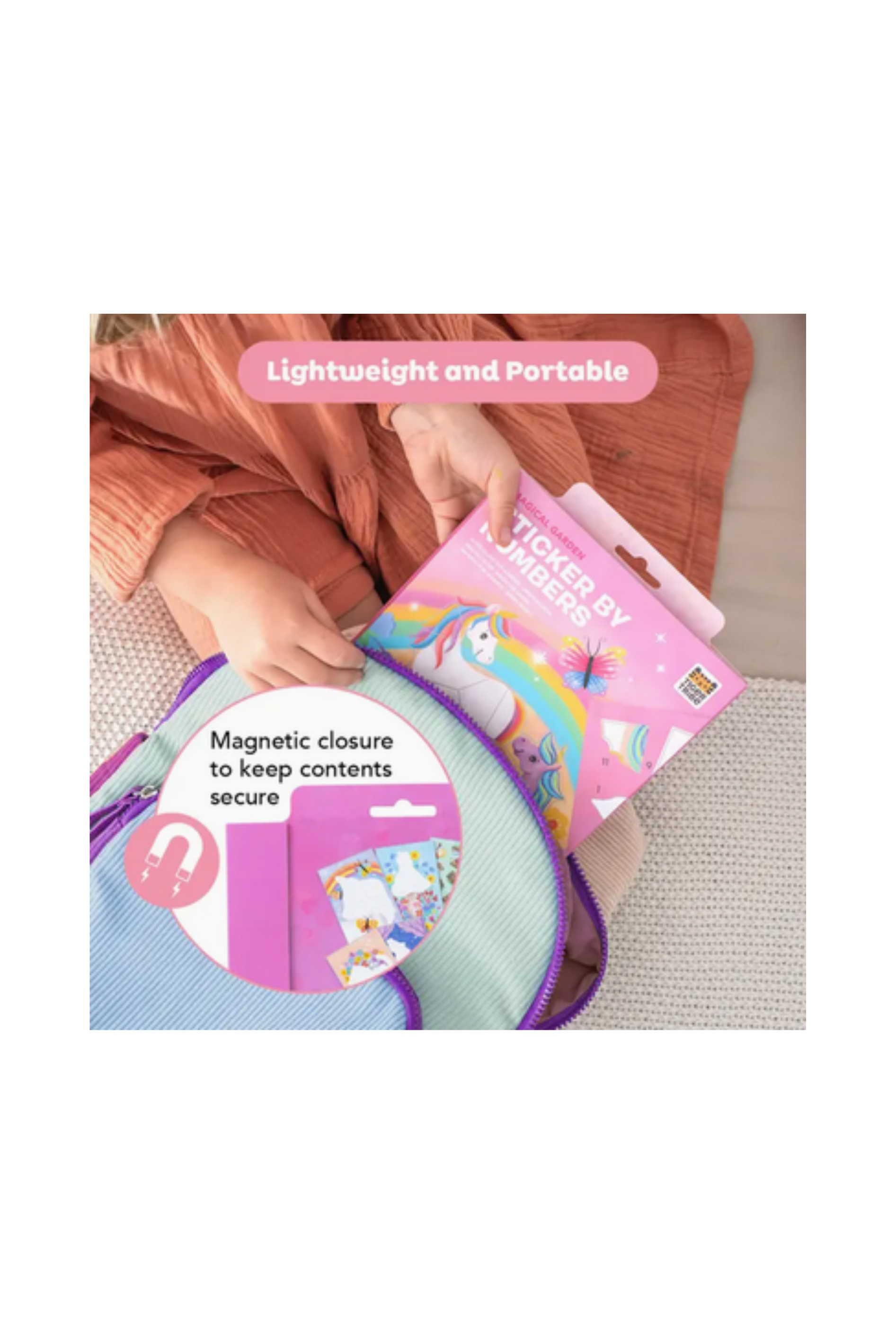 Explore a magical garden full of unicorns and friends in this fun Sticker by Numbers set.Packaged in a compact, self-contained magnetic sealed case, this is perfect for kids on the go. Includes 16 unique illustrated templates, 16 numbered sticker sheets to match with artworks