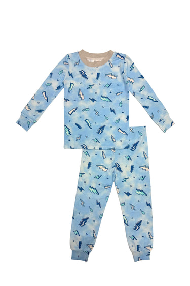 Introducing Esme's Baam Pajamas Set for boys. This light blue long sleeve set features a striking thunder print, adding a bold touch to bedtime. Made with comfort in mind, these pajamas will transport your little one to dreamland in style.
