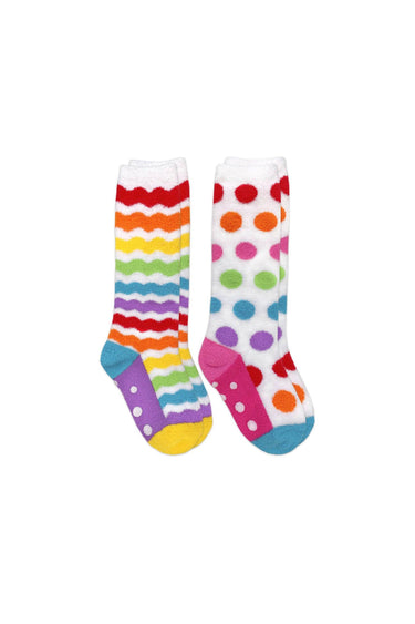Fun and fuzzy girl's slipper socks in a cute knee high length that comes right below the knee! Cute and colorful pattern designs include rainbow waves and polka dots. Super soft fuzzy knit keeps legs and feet extra comfortable. Non-skid grippers on bottom of socks keep feet from slipping on floor. Perfect for dressing up fun outfits for school, play, lounge wear, and everyday.