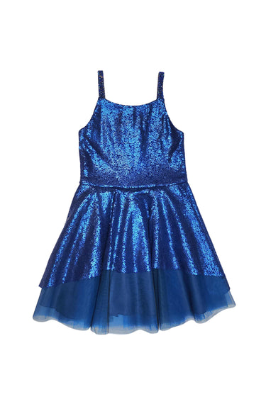 The "Nancy" dress boasts stunning sequin details and a delicate tulle underlay. Its scoop neckline and sleeveless design add a touch of elegance to the mini-length A-line silhouette.
