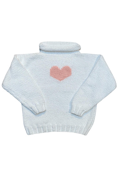 These adorable, customized, hand-knit cotton sweaters are handmade. The perfect gift for kids! Features roll neck and cute pink heart motif.
