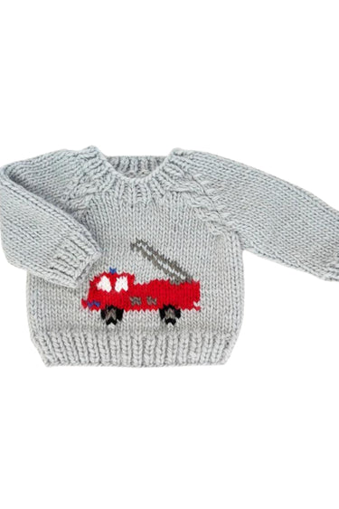 This ice gray pullover sweater features a red fire engine knit on the front, with a softly knit neck for easy wear. Hand-knit with cozy yarn and cable trim raglan sleeves, this sweater is soft and warm, perfect for any little person.