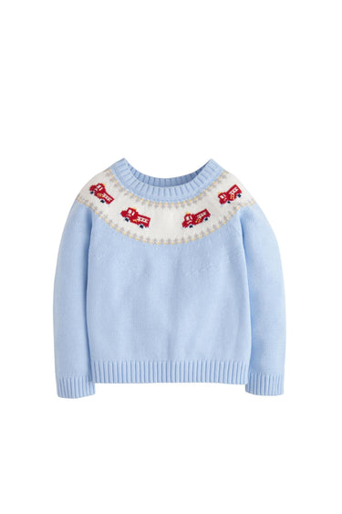 Indulge in luxury with our Little English Fire Truck Fair Isle Sweater. Made of light blue knit and adorned with charming fire truck motifs, this sweater is perfect for your little boy. Let him explore the world in style with this sophisticated and exclusive piece.