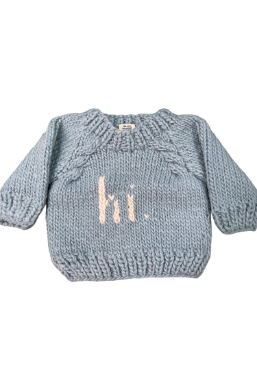 What a fun way to greet the world! Say hi. with our cozy pullover sweater knit in Surf Blue hued yarn. It has cable trim raglan sleeves with hi. knit into the front in Natural yarn. The neck is softly knit, making it easy to pull over little heads. Hand-knit in chunky yarn, it is soft and warm. This is such a great sweater, perfect for any little girl