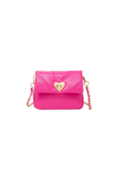 This purse features a very soft quilted texture. The front flap has a heart shape twist lock. The inside has a separate zipper compartment for coins. It comes with a beautiful chain that has a matching interwoven leather strap.