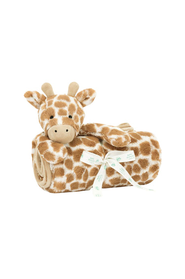 Introducing the delightfully soft and snuggly Bashful Giraffe Blankie. Combining our most loved Bashful Giraffe's adorably perky ears and horns, and squashy paws with a blankie made from the same irresistibly soft fur made of recycled fibers. Neatly rolled and tied with a Baby Jellycat grosgrain ribbon, this is an endearing gift full of comfort and companionship.