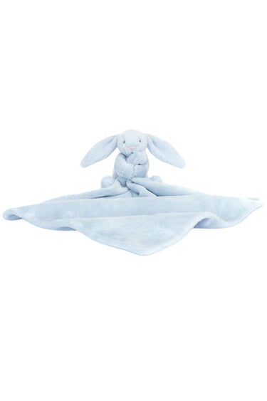 A perfect gift for newborns, the Bashful Blue Bunny Soother is our most loved Bashful Bunny in a soft fur, with long lopped ears, a pink suedette nose and stitched eye detail holding a square shaped soother, un-stuffed and irresistibly soft to touch. Made from recycled fibers and neatly rolled up and presented with a Baby Jellycat grosgrain ribbon.