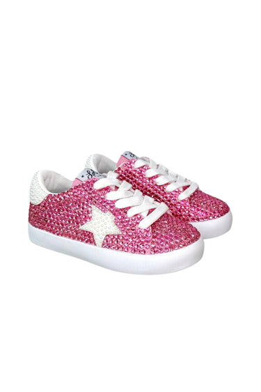 Glamorous pink sneakers adorned with sparkling crystals and pearl accents. Features a stylish star design embellished with pearls for a unique touch. Comfortable and durable with a cushioned insole and lace-up closure for a secure fit. Perfect for adding a touch of bling to casual outfits, parties, or any special occasion. Lightweight sole providing excellent support and comfort for active wear.