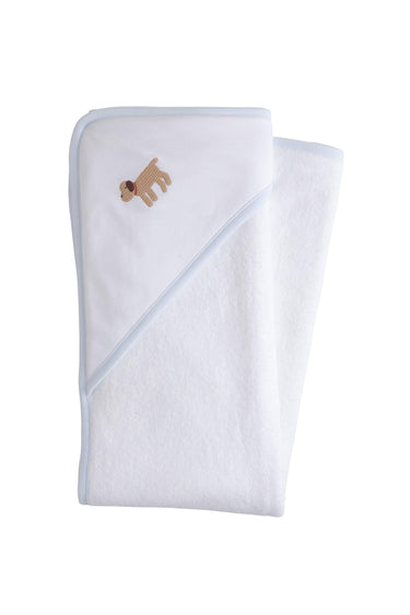 A luxuriously soft hooded towel with a blue hue trim. Embellished with an elegant dog design.