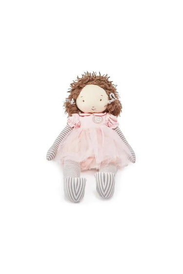 Our lovable soft Elsie doll, now with brown hair, is a pretty sweet companion and happily reminds little ones what being pretty is all about. Pretty inside patch stitched to her vintage pink blush cotton and tulle tutu dress. Soft knit grey and white striped body are perfect for toting around the house and cuddling up for story time. Vintage look makes for a timeless appeal, a perfect choice for a baby's first doll. She comes with a wee booklet and story of how Elsie learns through her friends that true beauty comes from within. Sure to be a treasured friend and keepsake for your little one. The perfect choice for baby's first doll, as she is heirloom quality, yet soft and lovable, with details that are sure to be appreciated throughout the years.
