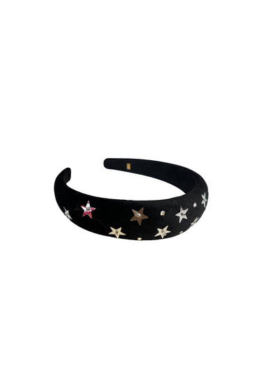 This unique satin headband is accented with little stars and adorned to perfection with Crystals.