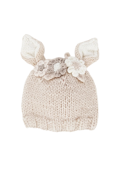 Soft hand knit beanie hat in natural has stand-up bunny ears lined in creamy white yarn and trimmed in a pretty garland of flowers in shades of cream and tan. Perfect for Easter and Halloween wear, or anytime you want to look adorbs like a cute little cottontail!!