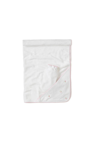 Tiny rosebuds pattern this towel and washing mitt duo designed to make bathtime a breeze. Made from 100% Pima cotton to wrap your little one in softness and comfort.