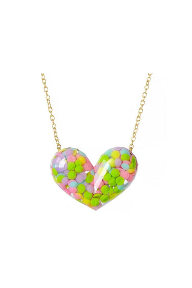 Resin heart with embedded multi color confetti pieces on gold electroplated chain. Comes packaged in its own adorable gift-ready slide box.