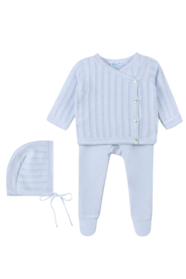 A timeless, vintage style knit set for your baby. This 3-piece knit set features a classic pointelle design for an heirloom style - great as a take-me-home outfit, gift set, or for special occasions. NEW! Now available in Blue & Pink as well!