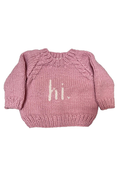 What a fun way to greet the world! Say hi. with our cozy pullover sweater knit in Rosy hued yarn. It has cable trim raglan sleeves with hi. knit into the front in Natural yarn. The neck is softly knit, making it easy to pull over little heads. Hand-knit in chunky yarn, it is soft and warm. This is such a great sweater, perfect for any little girl.