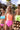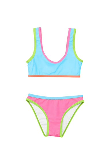 Be seen on the beach with this block-colored crop bikini for girls. The top pops in aqua with vibrant pink, citron, and orange trim, tailored with removable padding for a customized fit in larger sizes. The pink bottoms keep the fun going with their vibrant hue.