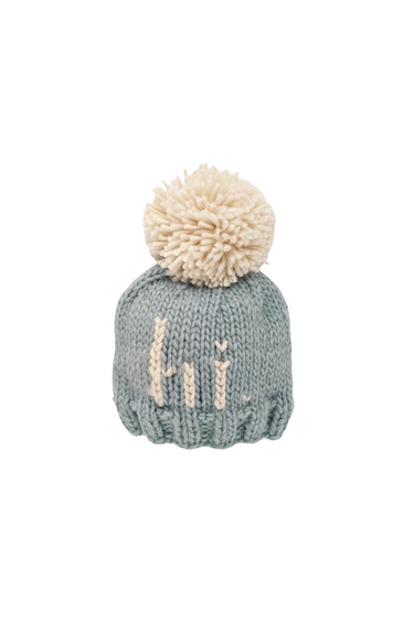 What a cute way to greet the world! This beanie is hand knit in cozy Surf Blue hued yarn with the word 'hi.' in natural colored yarn. Topped with a natural yarn pom pom, this looks great with everything and is a fun gender neutral baby gift.