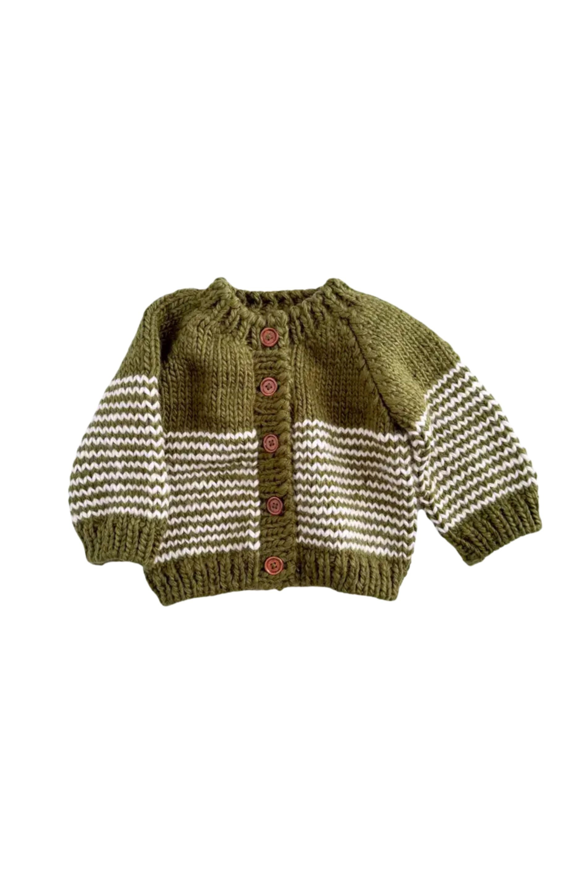 A classic stripe cardigan for Fall outfits through Holiday festivities. Match this Moss green sweater with Cream stripes and wooden buttons with a Classic pom hat and mittens.