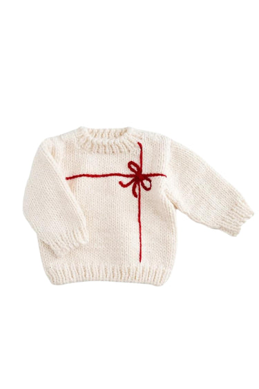A fun Holiday sweater to celebration the biggest gifts in life. Features Red yarn bow, ribbed trim, and soft yarn. Pair this pullover Cream Present Sweater with our matching CREAM PRESENT HAT.
