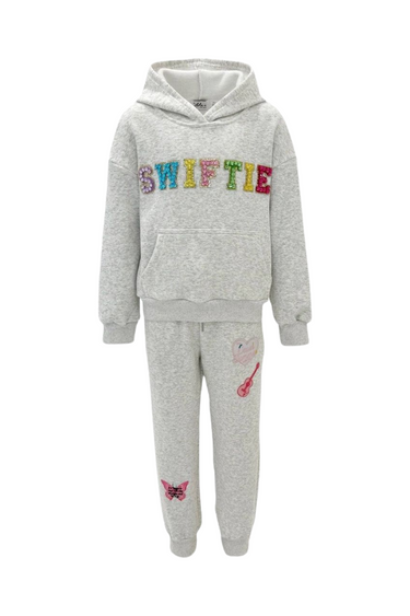 - Cozy grey track set featuring a bold "SWIFTIE" crystal-embellished hoodie, perfect for fans of fun, stylish casual wear.