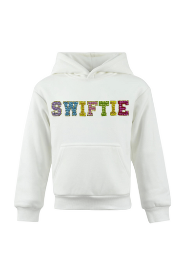 • This chic white tee is adorned with the word "SWIFTIE" in a spectrum of sparkling crystals, perfect for showing off their fun and vibrant personality.