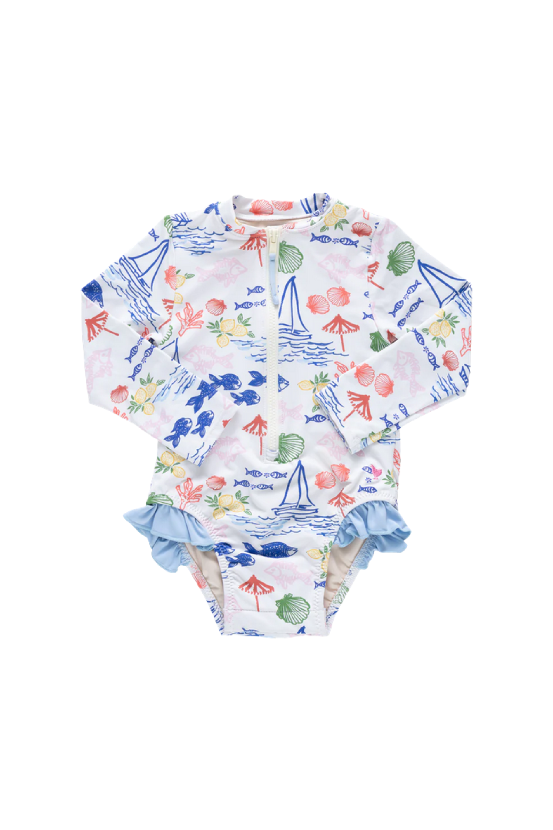Island muse! A collaboration with artist Ashley Begley, our Baby Girls Arden Suit blends form and function with painterly seashells, sailboats, and coral hues. Designed with long sleeves, a front zipper pull, ruffled leg openings, and easy snap closures for all-day sun-safe play. Match with big sis in the Girls Arden Suit for a picture-perfect duo.