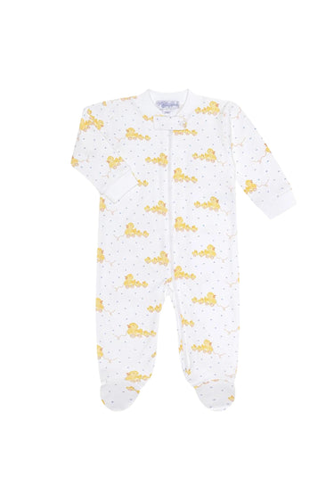 Indulge your little one in luxury with our Blue Ducks Print Zipper Footie. Adorned with charming printed ducks on a crisp white fabric with elegant blue accents, this footie is perfect for your stylish baby. Crafted for both comfort and style, it's the perfect addition to any chic nursery.