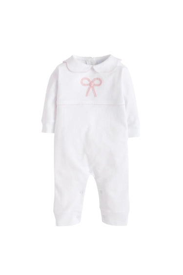 Our Pink Bow Crochet Playsuit is an adorable, signature style for baby girls with a simple pink bow design that's crocheted by hand for the sweetest look for babies. This playsuit is made from soft, 100% Peruvian Pima cotton and features light pink picot trim along the scalloped collar and across the chest. Add our matching PINK BOW CROCHET SWEATER to indulge your little one or give the gift of timeless style with this signature look!