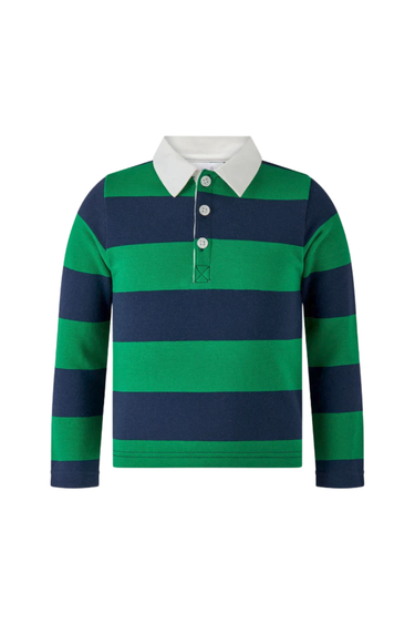 New! Elevate your little one's casual look with our Stripe Rugby Top. The stylish navy and green maxi stripes, along with the contrasting ivory collar and button placket, make for a perfect school option. Pair with a classic pair of trousers for a playful yet put-together look.