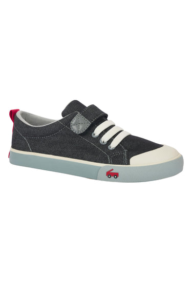 Step up their sneaker game with our classic black denim sneaker with gray accents! Featuring a leather lined removable molded footbed for happy feet, a natural rubber toe cap for superhero-level protection, and lightweight, flexible construction for all-day play.