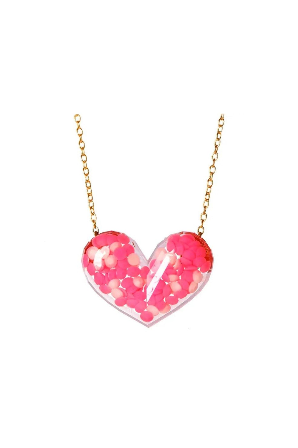 Resin heart with embedded pink confetti pieces on gold electroplated chain. Comes packaged in its own adorable gift-ready slide box.
