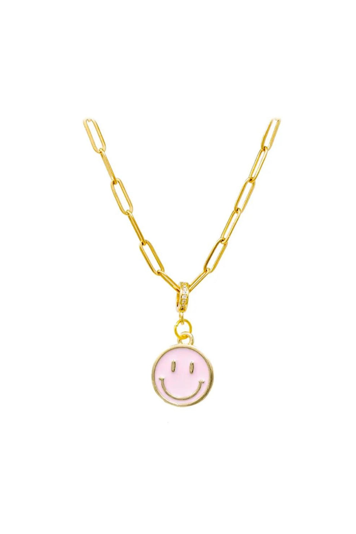 Cute adjustable happy face necklaces with paperclip style chain. The charm closure is covered with crystals to give this necklace an extra pop.