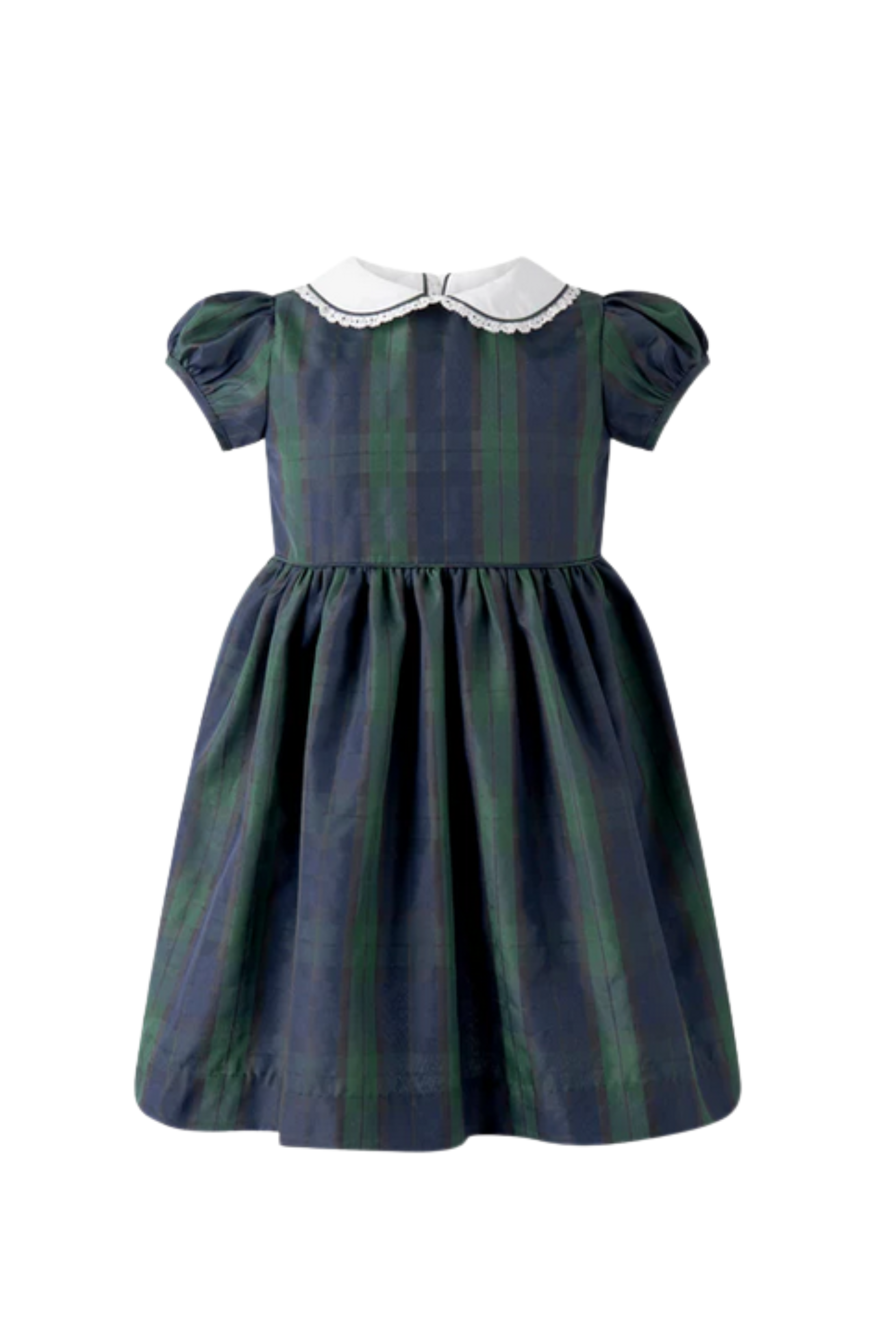New! This charming Black watch Dress & Bloomers set features a delightful plaid pattern in dark navy and green, perfect for little adventurers. The playful puff sleeves add a touch of fun, while the ivory Peter Pan collar, trimmed with navy piping and delicate lace, brings classic charm. Easy button closure and a sash tie at the back ensure a comfy fit for all-day play. Ideal for twirling and exploring in style!